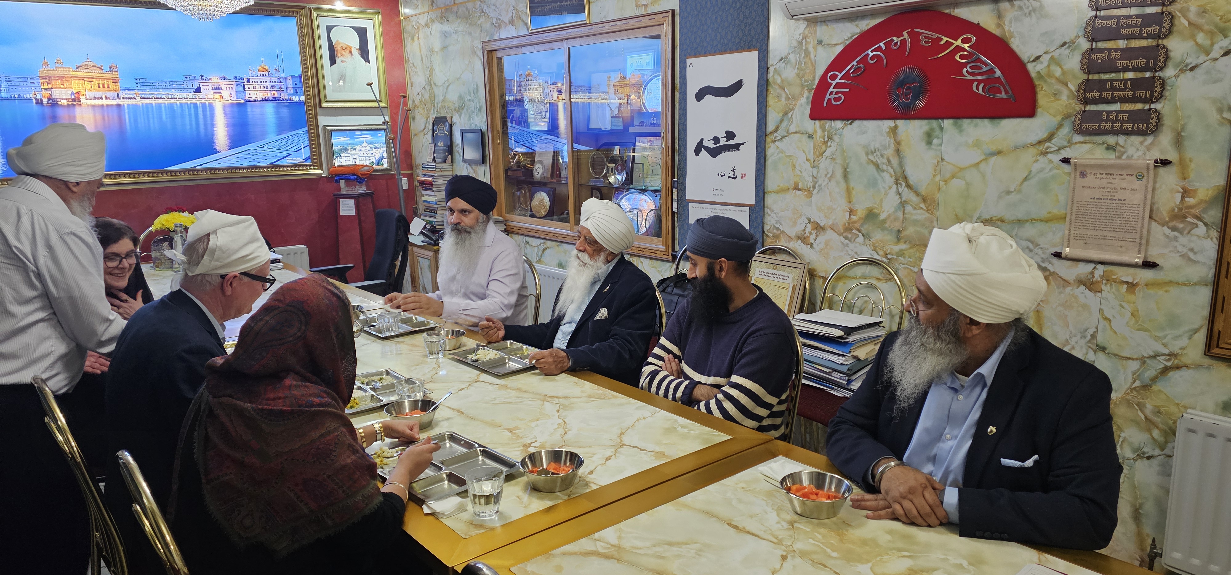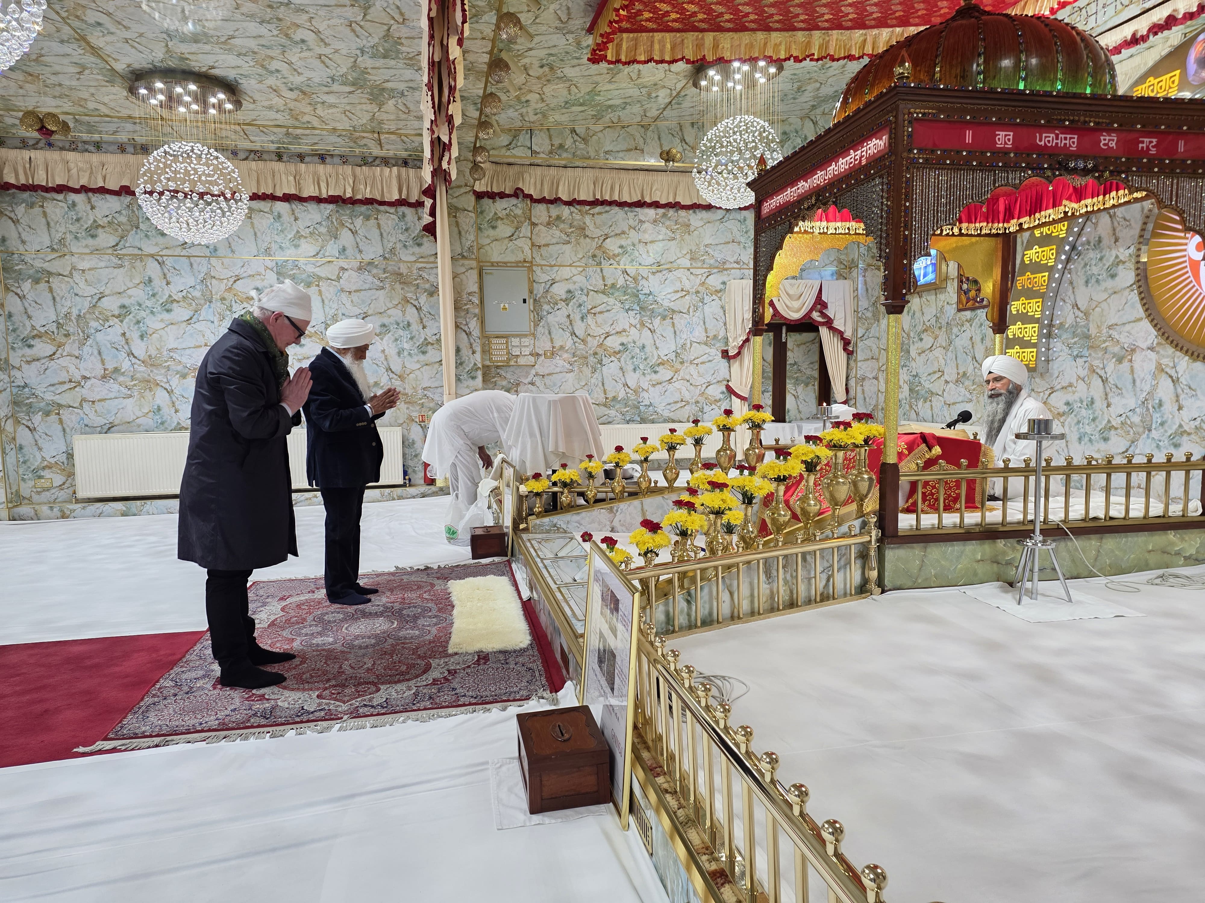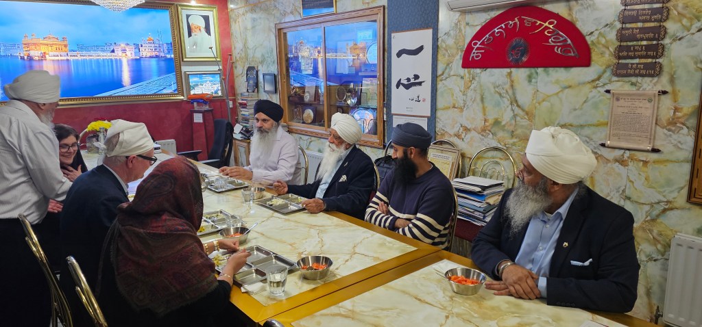 The Mayor was welcomed by the leadership team before paying obeisance to Sri Guru Granth Sahib Ji in the Main Darbar Sahib and then visited the Gumbad Darbar Sahib (Dome Darbar – an eloquent introduction of Sikh architecture, where a 30-ton reinforced concrete dome was created for the first time in Europe). The host team shared the organisation’s long history of spiritual regeneration, interfaith work, its global service ethos, the central role of values, and community cohesion in its mission.